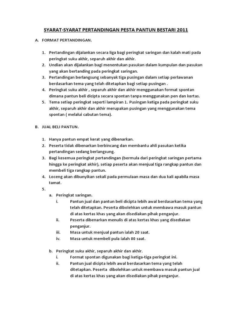 72 Peringkat Negeri Melaka 8 SYARAT-SYARAT PERTANDINGAN 81 Penyertaan setiap kategori hendaklah berada dalam kawasan pentadbiran Majlis Perbandaran Jasin.
